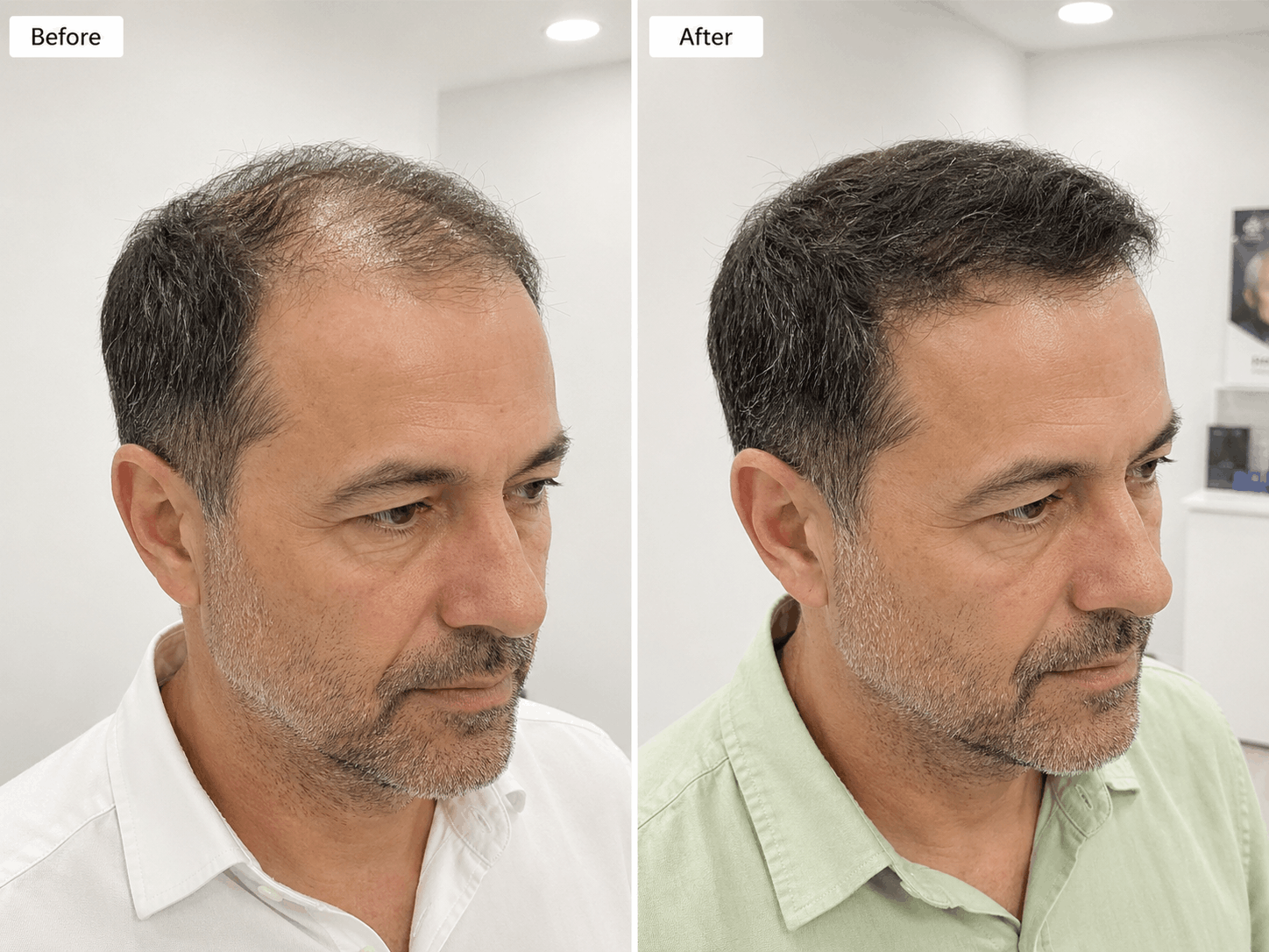 | Type II | Minor recession at the temples. Early hairline changes. | Very good candidate. Follicles healthy and responsive. |